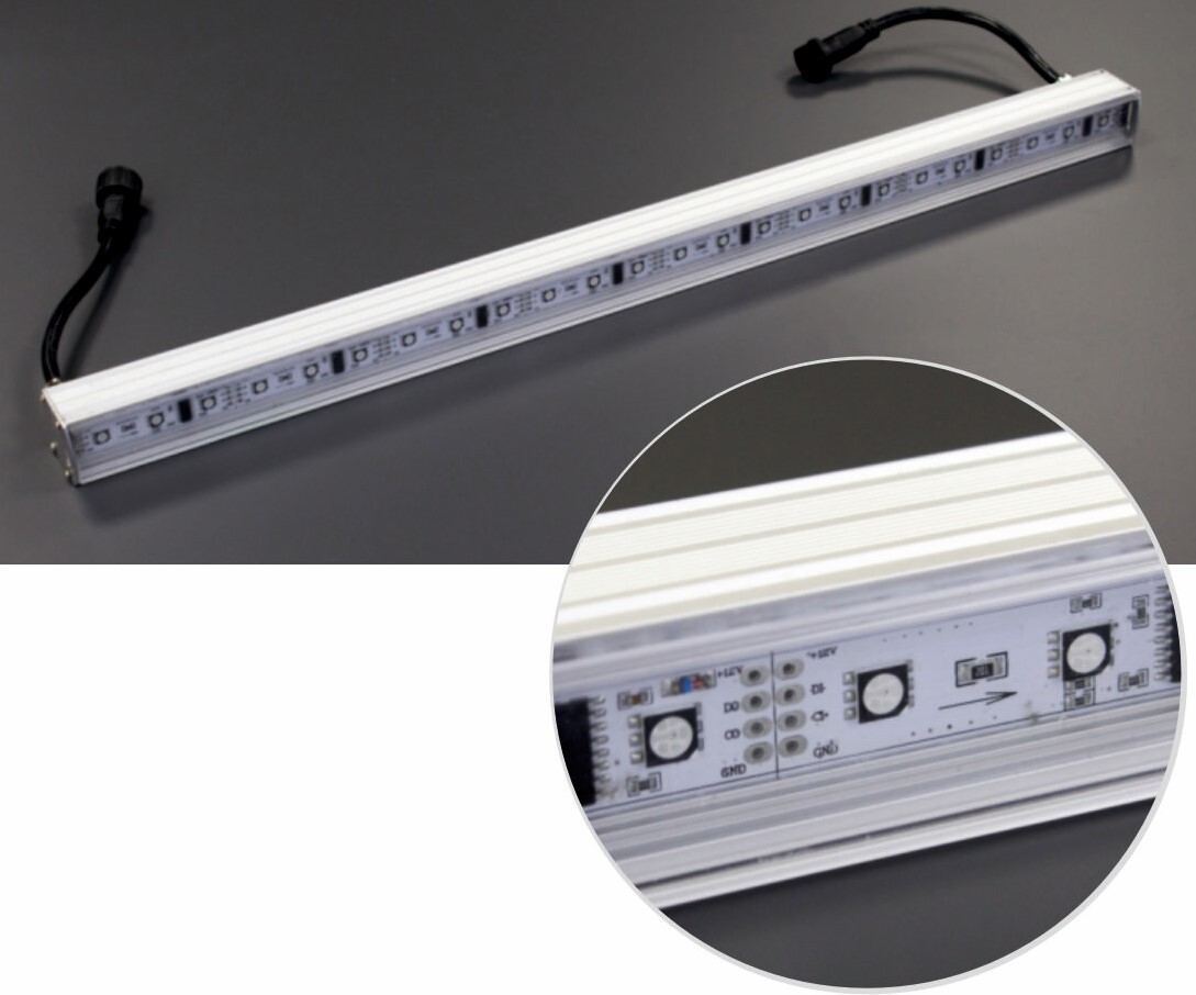 Технические характеристики для всех светильников: Тип диода: RGB 5050 / RGB 3535 (для UCS1903) Контроллер: SM16716 / 16726 / UCS1903 / UCS512C4 Количество светодиодов: 48 Количество управляемых сегментов:16 Расстояние между светодиодами: 21 мм Напряжение питания: DC 12 V Потребляемая мощность: 12 W/m Световой поток: 258,24 lm/m Угол светового потока: 40 гр. Класс защиты: IP67 / IP20 Корпус: Алюминий (серебристый / черный) Размер: 1000*27*30 (60 с кронштейном) мм Вес: 610г (светильник длиной 1 м с разъемами) / 50г (комплект кронштейнов)